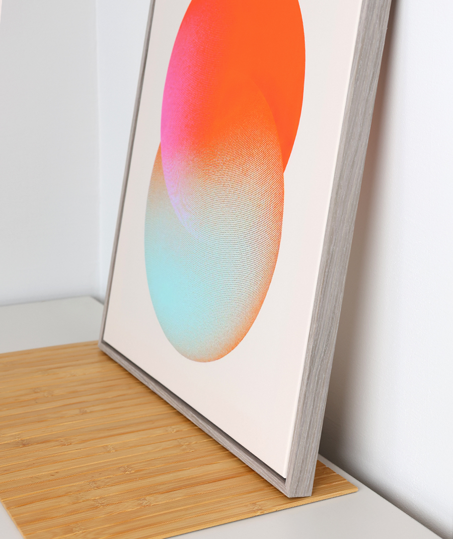 A premium gray wood floating frame that brings cool, understated sophistication to your canvas.
